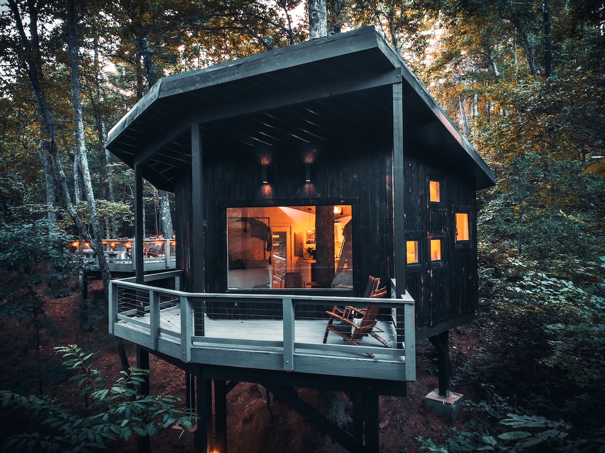 Dragonfly Treehouse: A Romantic Getaway in Dahlonega, GA Escape to the serene beauty of Dahlonega, GA, and experience the magic of The Dragonfly Treehouse—your perfect romantic retreat. Nestled among the trees, high above your own private pond. This luxurious hideaway offers everything you need for an unforgettable stay. Movie Theater, Hot Tub, Sauna, Nespresso, Soaking Tub, Luxury Shower, Heated Bathroom Floors, Towel Warmer, Put Green, Fire Pit, Outdoor Cabana Retreat w/TV and Floating Bed.