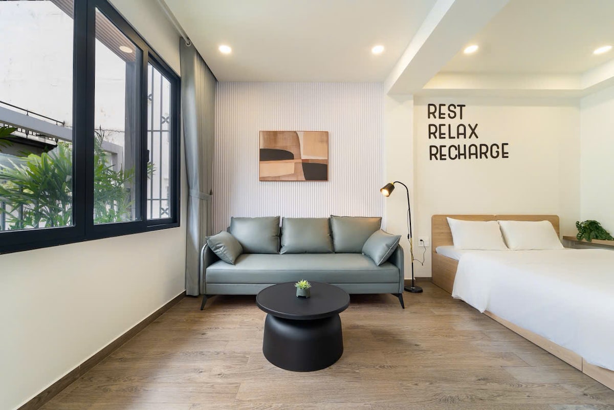 Escape to our serene Wabi Sabi-inspired haven nestled in the heart of the city's most peaceful residential area. This thoughtfully designed space sits just moments from Ben Thanh Market (5 minutes) and your morning coffee fix at Starbucks (1 minute away). Unwind with our impressive 100-inch projection system featuring premium Netflix access. Located in a beautifully renovated building with elevator access, you'll enjoy complete privacy and security in this safe, middle-class neighborhood.
