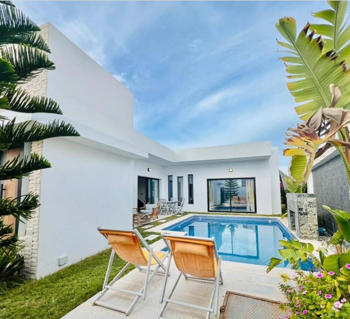 Villa moderne et 100% sans vis-à-vis. Très confortable, à 2 min (en voiture) de la zone touristique et 5 min de la plage. Grand salon + cuisine toute équipée 2 belles chambres Salle de bain : douche italienne et WC. Grande terrasse/jardin Piscine XXL 8mx5: transats, parasol, table, BBQ Équipement : clim, wifi, IPTV, produits d'hygiène, serviettes/textiles, café, thé, fer à repasser Quartier sécurisé, supérette/boucherie à 5min à pied, Pour bébé : lit, baignoire, vaisselle, chaise haute, etc..