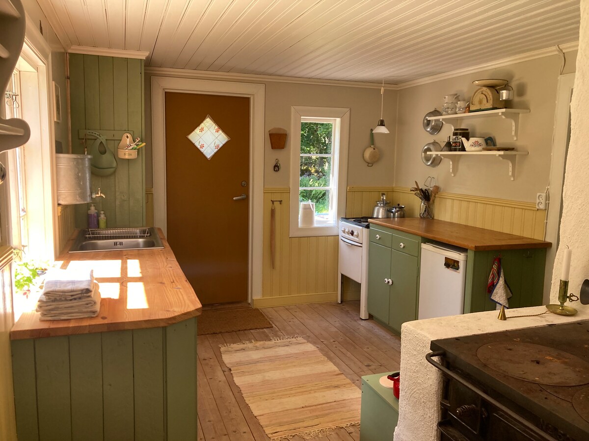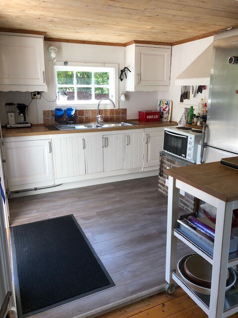 A charming cottage by the sea with a terrace facing the south. The terrace is furnished with a lounge set and bbq. Inside there is a fully equipped kitchen, a bath room with shower and incineration toilet. The living includes access to a small sand beach, a sauna and a pier with a floating dock for relax and bath. On the ground we have our main house and also free-range chickens and a wonderful cat. Feel free to pick your fresh breakfast eggs. Bikes, SUP and some fishing gear available
