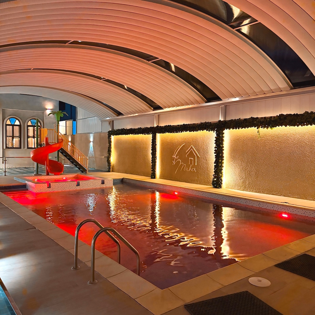 This villa is great for families and friends. It has 4 bedrooms, a spacious living room, billiards table, and plenty of space to relax. Outside, enjoy two pools one with kids slides and another for adults, plus an open majlis to sit and talk. There’s also a BBQ or campfire area and a small playground for the kids. A calm place to gather, unwind, and enjoy time together.
