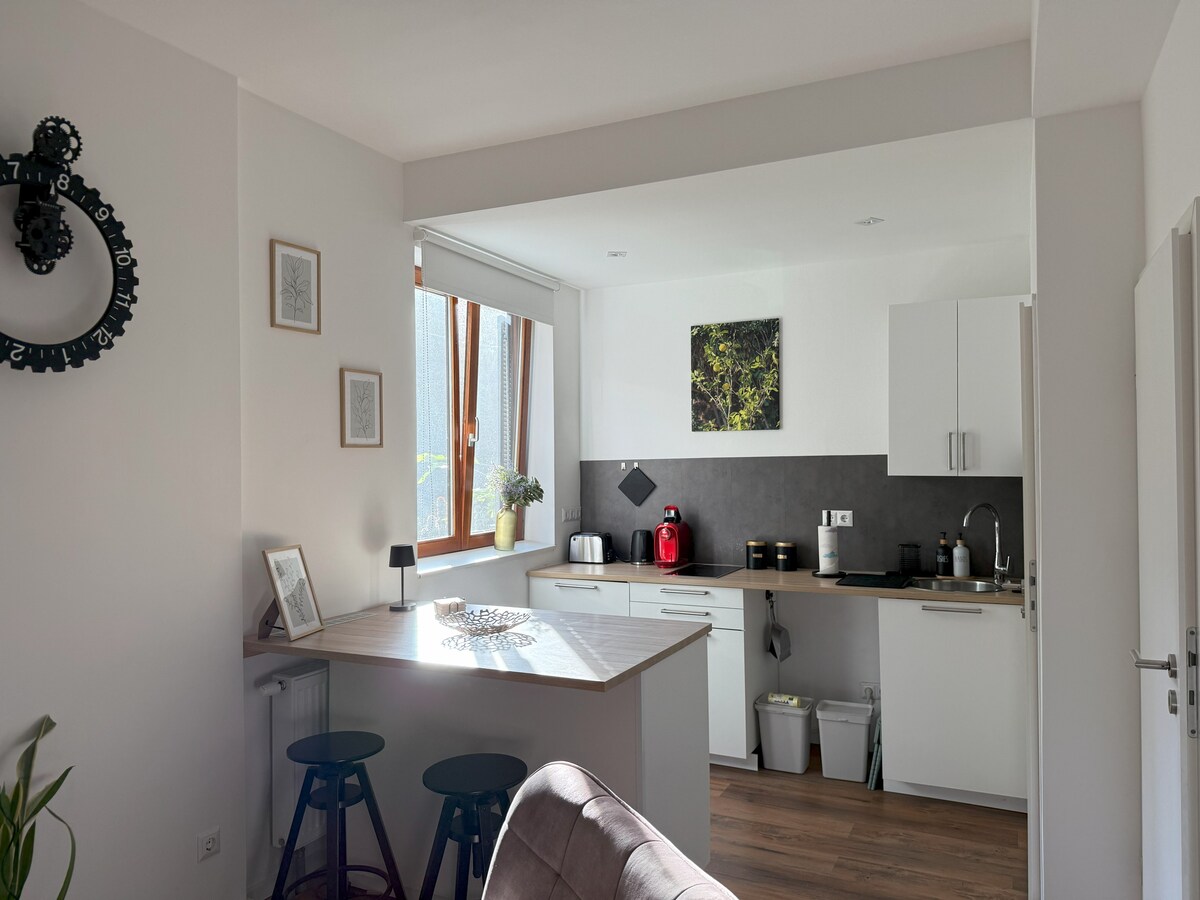 45 sqm apartment for 2 people with shower bath/toilet including kitchen, dishwasher, 2-burner induction stove, fridge and bar with seating. Kitchen is equipped for eating and cooking - cutlery, glasses, plates, pots etc. Walk-in closet available. Cozy balcony with seating. Please note that this property has a large double bed under the roof, with a standing height of 160 cm and can be reached via a wooden staircase.