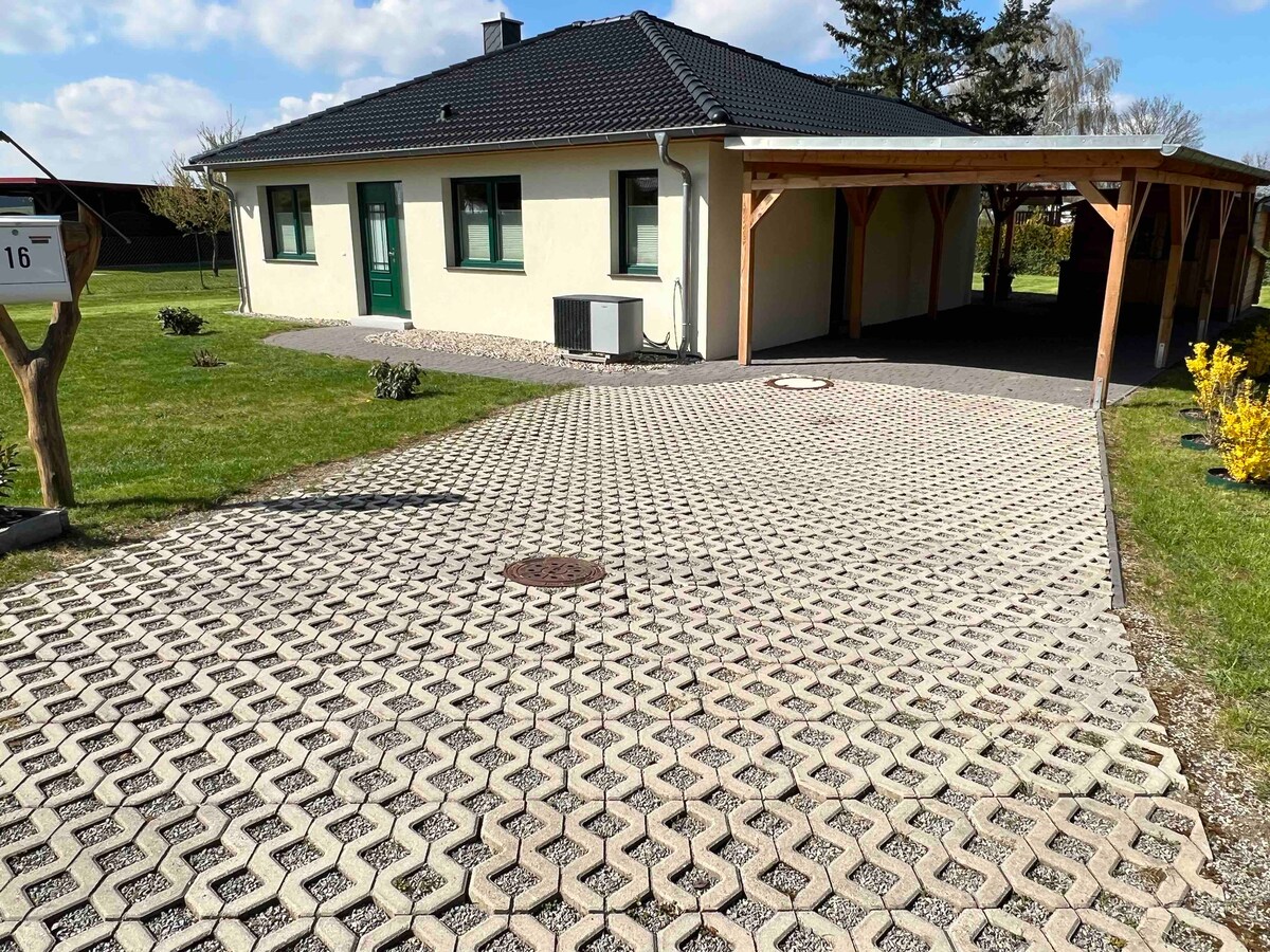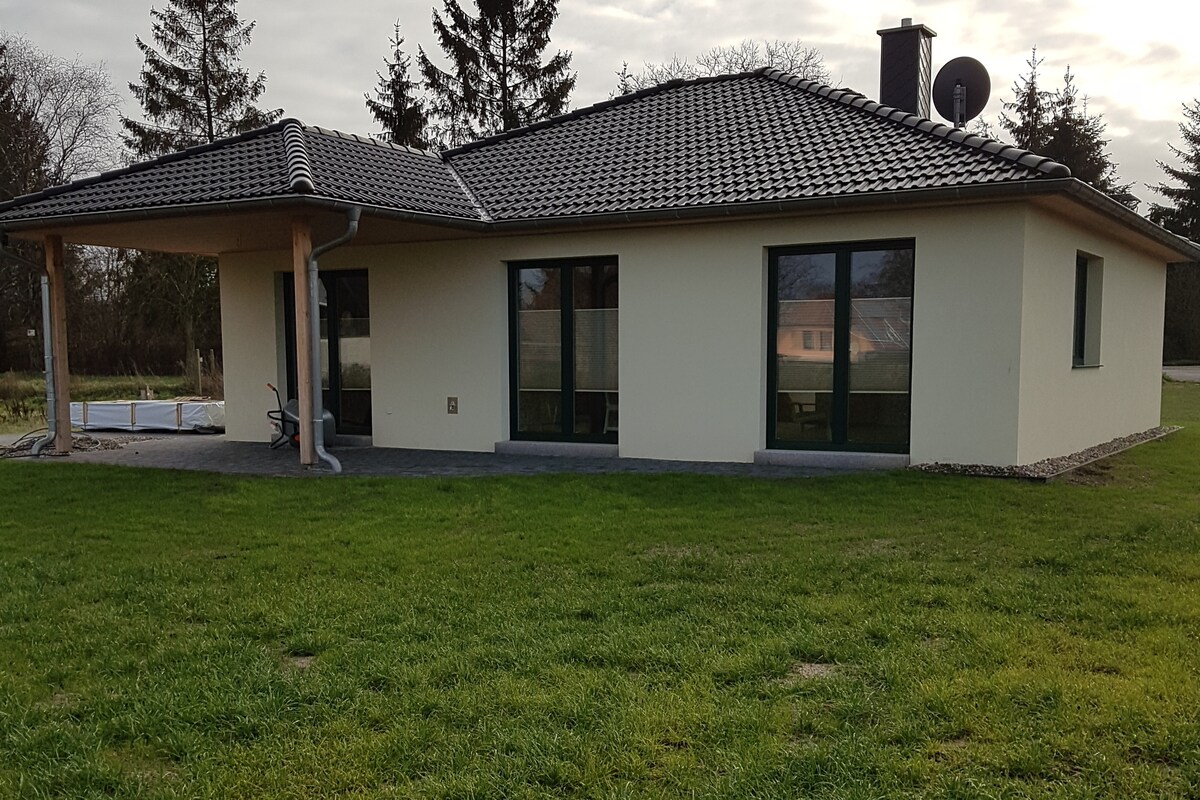 The cottage was completed at the end of 2019. It is about 100 square meters, with a covered terrace and a large garden. Mönchbusch is a small district of Alt Schwerin. It's really very, very quiet there. If you are lucky, you can watch the deer or wild boar from the garden in the field. Plauer See is only 2 km away. If you love nature and are looking for peace, this is the place to be. There are many possibilities for hiking, biking or water sports.