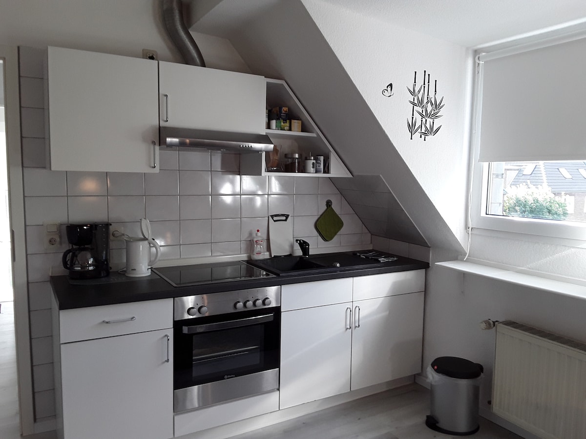 Bright apartment in the attic, 2nd floor with fully equipped kitchen, daylight bathroom with bathtub comfortable bed 100 x 200 in a quiet location with good connections (e.g. to the airport, trade fair by car 5-10 minutes).