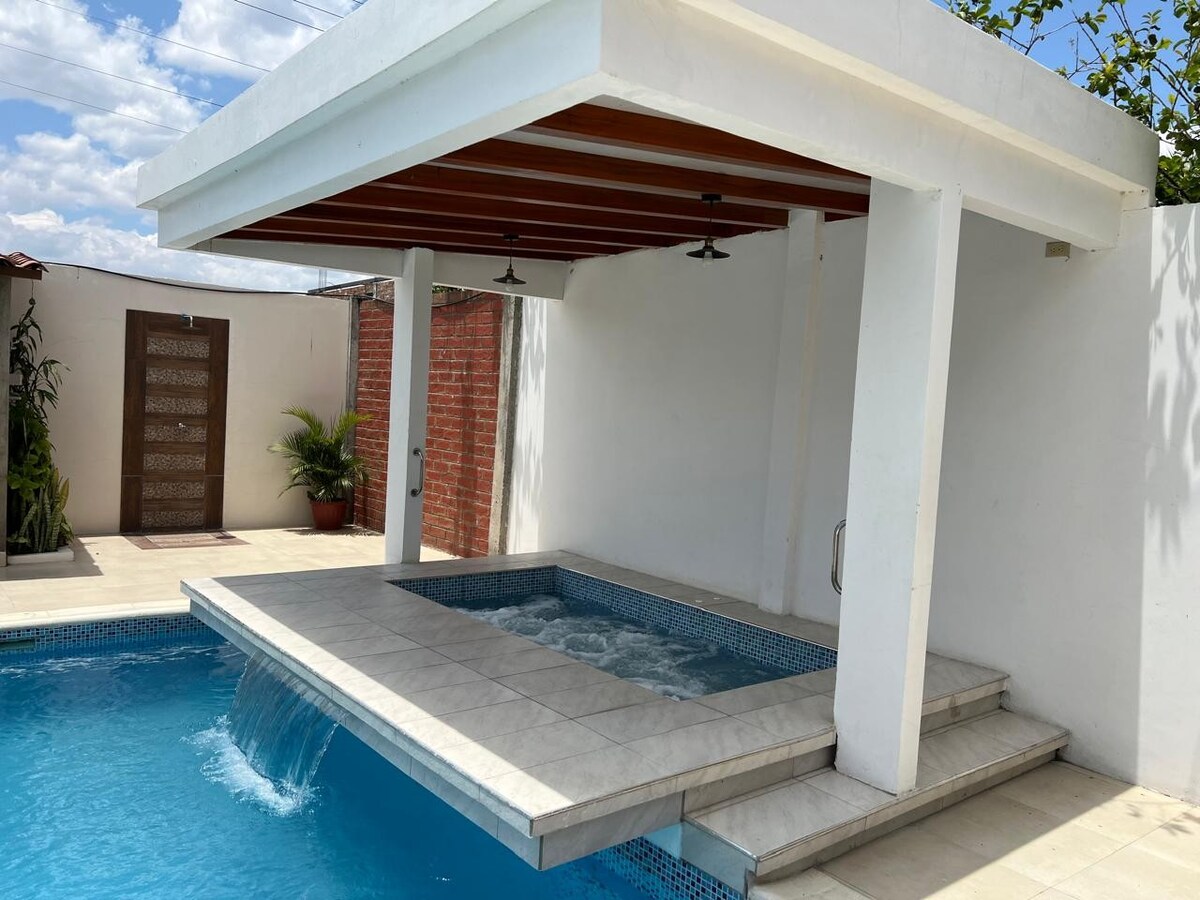 The best house in the city of eternal sun, its location allows you to enjoy nature and in a few minutes be downtown. Located 5 minutes from the airport and 45 minutes from the Basilica del Cisne. Capacity 10 people (max12) and pets are allowed. The house has spacious corridors, 2 indoor rooms, 4 outdoor rooms, 3 spacious bedrooms, 3 full bathrooms, outdoor shower, fully equipped kitchen, swimming pool, whirlpool, BBQ area, laundry, green area and garage for 3 cars.