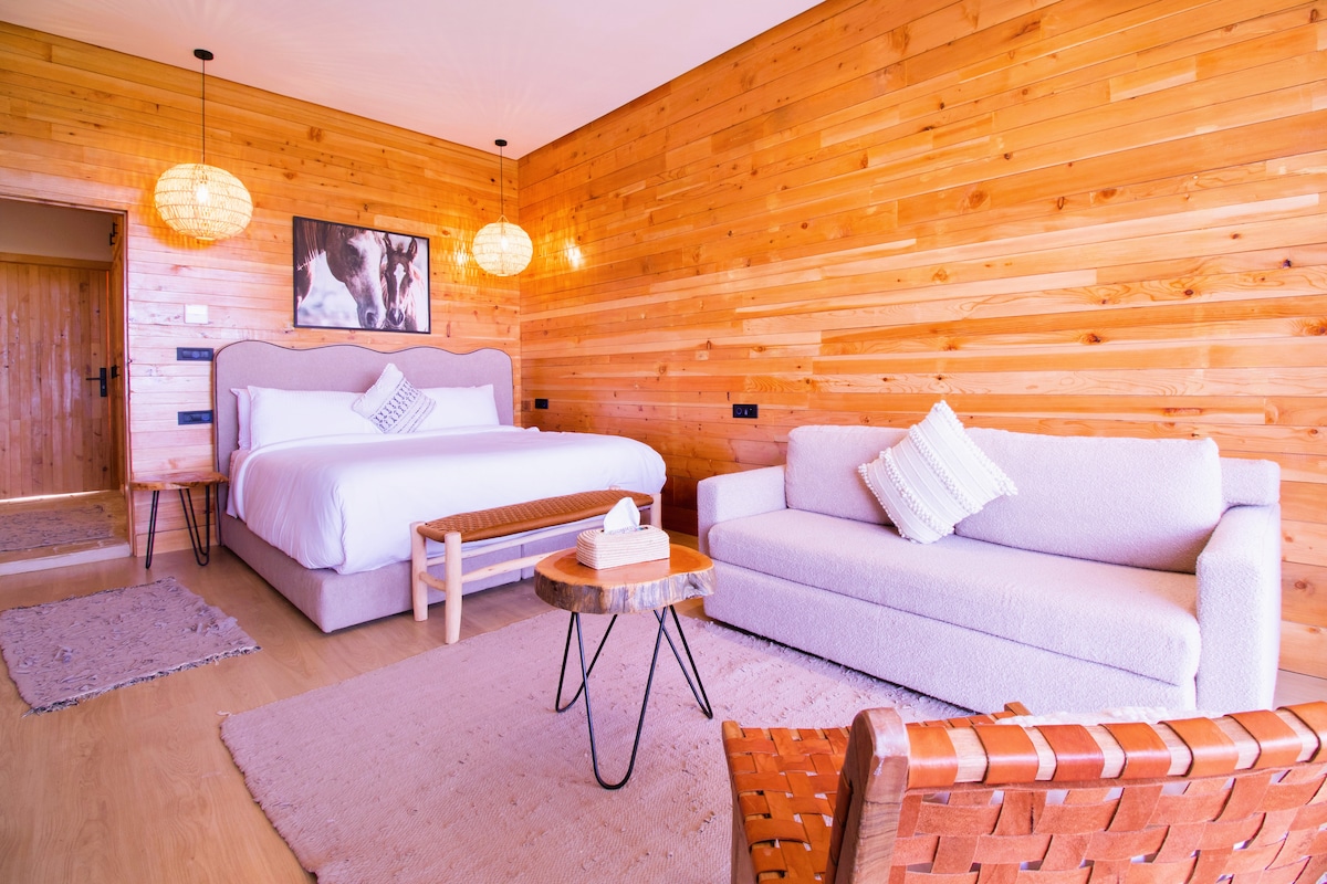 Important Note: There is a construction site near the chalet. There might be some noise after 9am. Welcome to our Scandinavian style chalet set in a permaculture farm in the Atlas Mountains. It features a cozy wooden interiors, 2 bedrooms, a modern kitchen & a living area. The terrace has an outdoor kitchen/ BBQ. It’s a perfect base to explore hiking in Ifrane National Park & slow living. Enjoy a farm-to-table breakfast / meal, available to order. Complimentary 5GB wifi offered per stay
