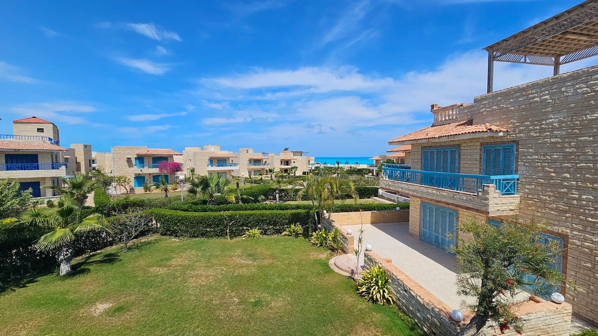 Relax at Badr resort in 83 km north coast with the whole family at this peaceful place to stay in vella ground chalet with 2 private gardens with private terrace swings and basketball in garden for fun. with very nice garden open view. 2 large bed rooms and 1 big bathroom and kitchen 7 beds in the rooms and 3 sofa bed in the hall open veiw full air-conditions cool and heat. with all appliances
