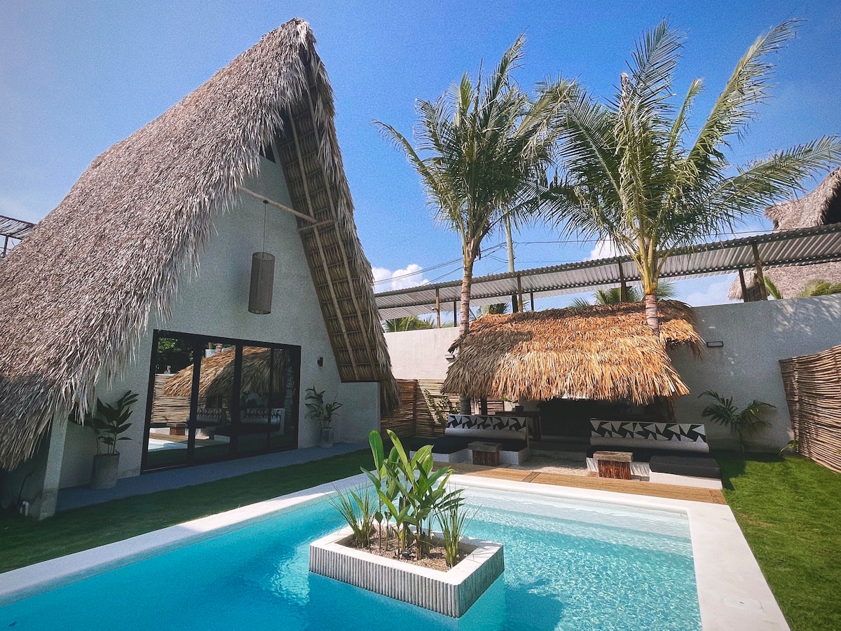 Escape to a romantic beach house with private access to the sea and an exclusive pool. The social area, combining a living room with ceiling fans and TV, dining area, and basic kitchen with an electric stove, opens to the outdoors, creating a perfect tropical ambiance. Directly in front of this area are the covered pool and tropical garden. Relax in the bedroom with air conditioning. Wi-Fi is available throughout the house. Ideal for couples seeking privacy and peace by the beach.