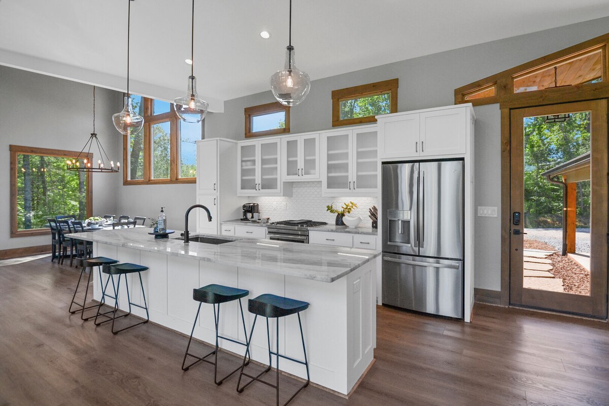 Enjoy lake and mountain views in this updated oasis amongst the trees. Whether you're looking for an outdoor adventure or a rejuvenating escape, we have it all! Situated on a five acre lake, enjoy the private dock and use of our two paddle boards and canoe. After a day of hiking, decompress in the hot tub and sauna. Tons of space to gather both indoors and outdoors, we hope you'll enjoy all the modern amenities while reconnecting with nature. Just 12 minutes to downtown Ellijay!