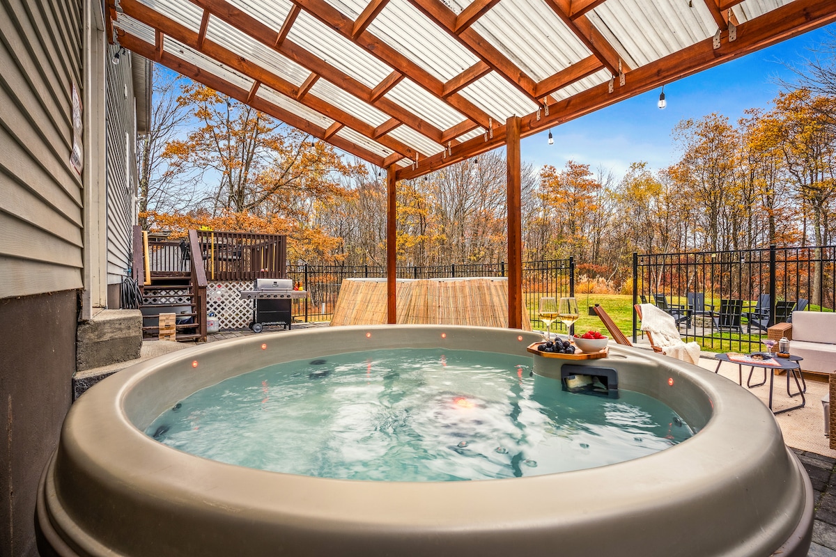 Welcome to Summitgrove Cabin in the Poconos! This modern yet cozy 3BR/2BA retreat blends comfort with style, featuring beautiful wood finishes and a warm interior. Step outside to a spacious yard and deck with hot tub, outdoor TV, dining area, BBQ, and gas firepit. Relax on sun lounges, sway in the hammock under string lights, or gather around the real wood firepit. The unique game room offers ping pong and board games. Located in a community with paid amenities, perfect for family fun.
