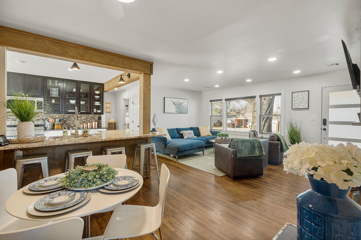 Stay in style at this newly renovated home (Aug 2025) near Expo Square, TU, Cherry Street, Utica Square, and Downtown Tulsa. ✰ Private fenced backyard with BBQ and patio seating ✰ Plush memory foam beds in every room, King in master ✰ 1000 Mbps Wi-Fi + 4 Roku TVs for streaming ✰ Fully equipped kitchen ✰ Washer/dryer, Pack-N-Play, high chair ✰ Easy self check-in ✰ Cozy electric fireplace ✰ Dogs welcome (3 max, under 80 lbs, $100 fee) Easily walk to TU and reach EXPO Square in under 3 miles.