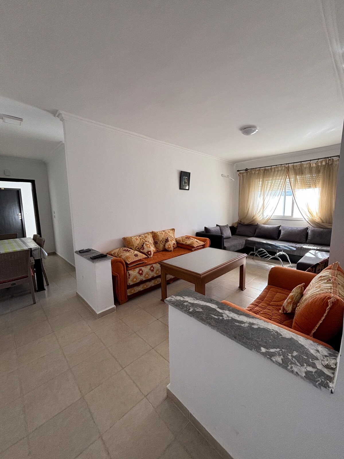 Quiet apartment close to all conveniences in a secured and quiet area Includes air conditioning, high-speed internet (100mbs) and a dedicated Workspace. Smart tv with Netflix, equipped kitchen, washing machine with dryer. Safe and free parking available (security cameras on premises) 10 miles away from tangier’s airport 5 miles away from the ancient Medina * information of ID required before checking in ** please specify the exact number of guests while booking ( max 3 guests)