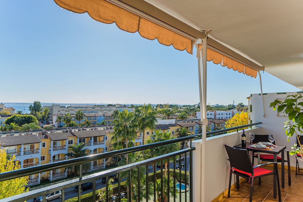 Welcome to our modern apartment in the heart of Puerto de Alcudia, boasting a stunning sea view terrace, a refreshing pool, and complimentary Wi-Fi. This one-bedroom flat accommodates two guests comfortably and is just a stone's throw away from the beach (150 meters).