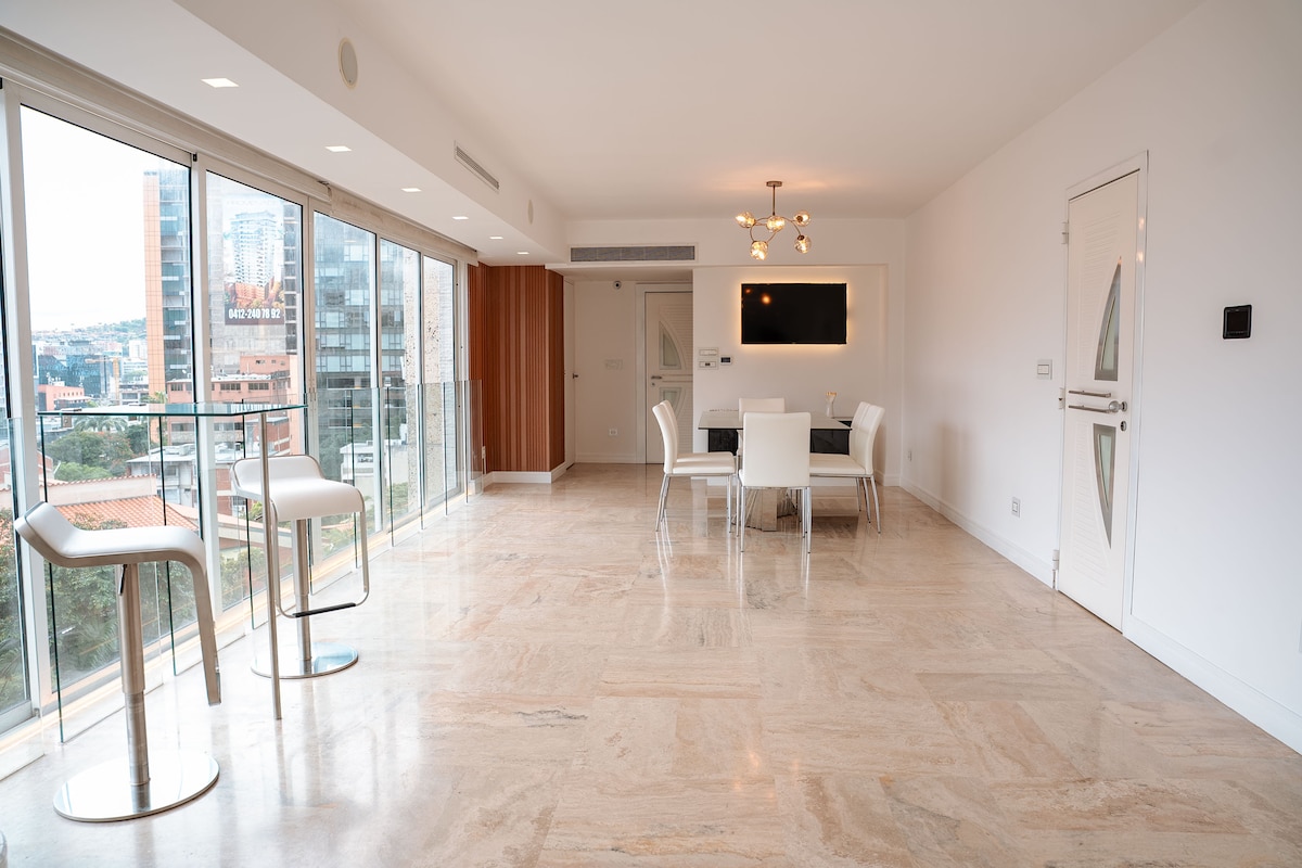 Disfruta de una experiencia elegante en un apartamento nuevo con acabados de lujo, con instalaciones de hotel 5 estrellas Comienza tu día con una tasa de café, disfrutando de una bella vista del Ávila y termínalo con una copa de vino en nuestra terraza con jacuzzi y vista 360 de Caracas. El Jacuzzi y la piscina son áreas comunes del edificio, NO son privadas. Apto totalmente equipado: utensilios de cocina, AC central, WIFI satelital, lencería - No se permiten fiestas o eventos -