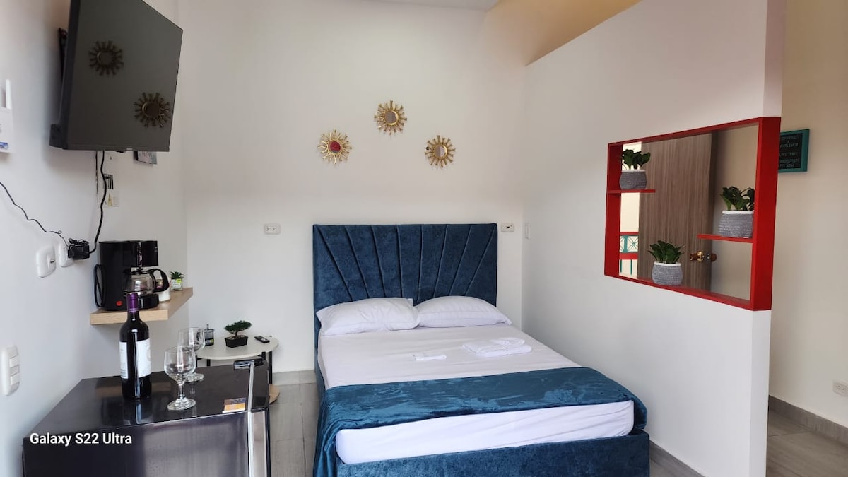 Cozy cabin-type apartment, ideal space for rest, it has a double-full bed and a single bed, with large windows and a perfect balcony to observe the mountain and the landscape that can be seen from there, also the birds that perch there, totally private and independent, it has a bathroom and shower with hot water, a kitchen equipped to prepare food, its strategic location just 450 meters from the main square and the Williz that lead to the Cocora Valley.