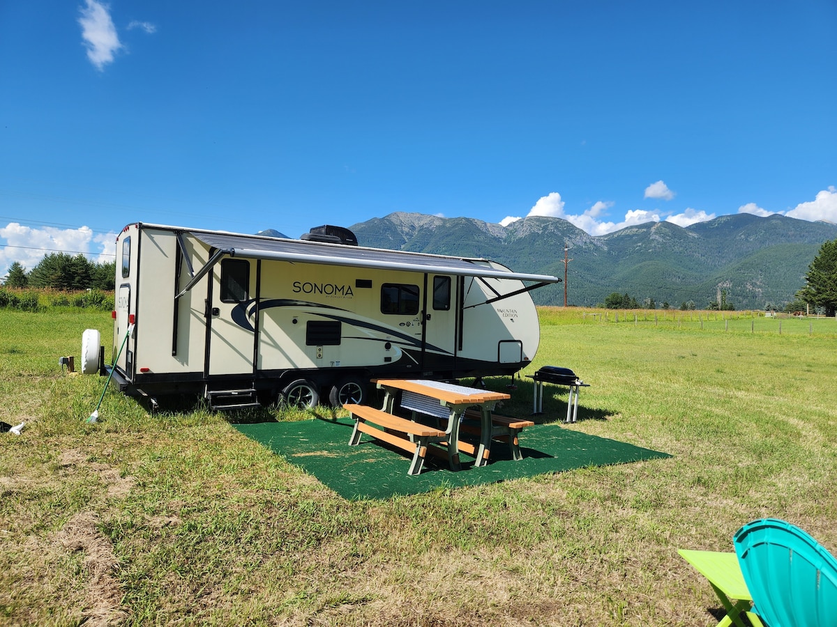 Your family will be close to everything when you stay at this centrally-located place in the Flathead Valley. This camper is parked in our front side yard. Clean and quiet yet family friendly. This beautiful camper can comfortably sleep 5 people and is fully equipped to cook a meal or sit by the fire pit enjoying s’mores with the family. We also provide great family games like connect four, corn hole or Yatzee. Ask us how to enjoy the day paddle boarding or kayaking we have everything you need.