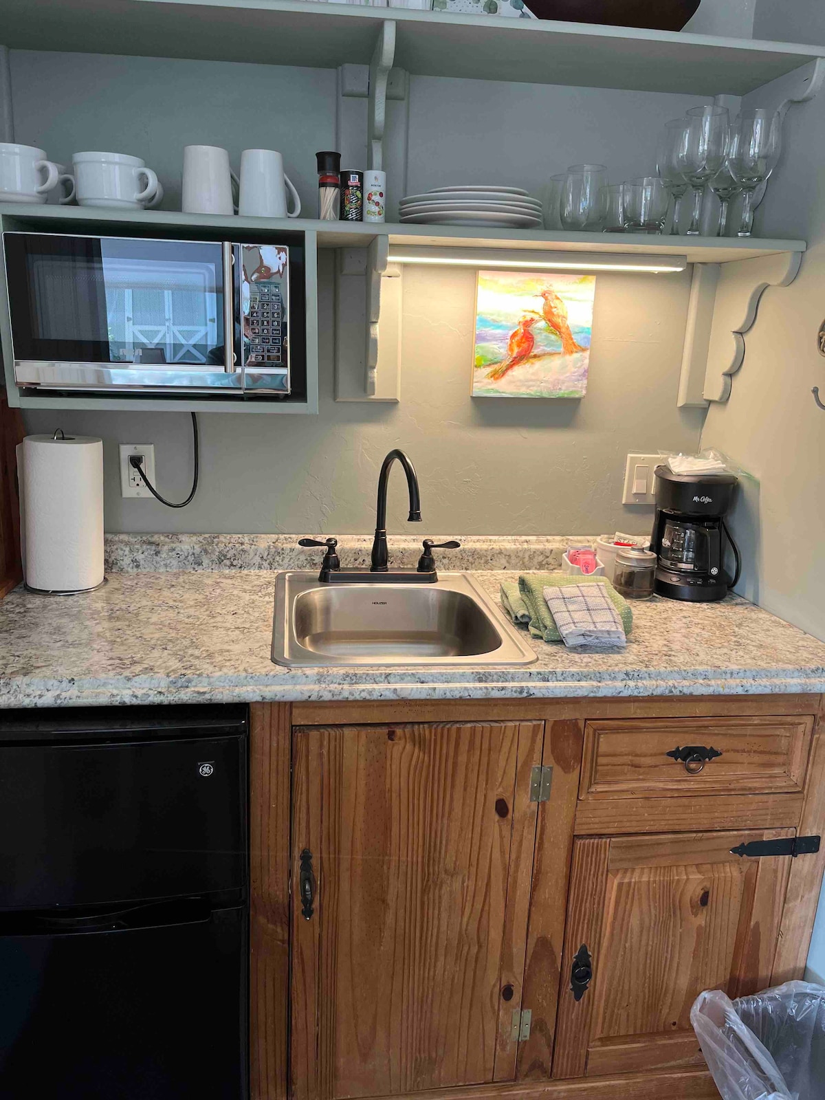 The Floras Lake Guest House is located in my garden at Floras Lake. A private bath, kitchenette (coffee pot, microwave, small frig, dishes, blender, toaster, etc.) queen bed and sitting area complete this private, serene space. An electric fireplace adds heat and a lovely ambience. A large screen television has access to Amazon and Netflix. WiFi service is provided. Guests have use of two kayaks (during summer months only), dock and viewing deck via a private stairway.