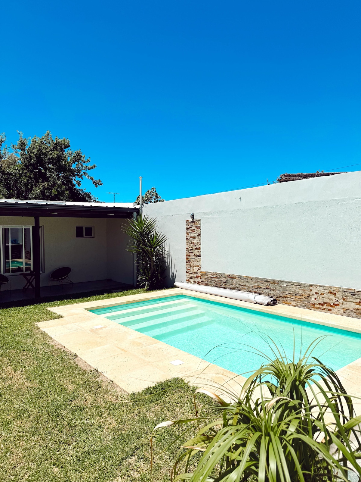 2 bedroom house, kitchen dining room ,bathroom and on a second floor a living room of 7×3 meters that can be used as a bedroom or be more. A very comfortable house and in it you can accommodate more than 10 people comfortably . Roofed front with grill . It has a beautiful somber and huge trees bordering the back of the property that makes it more private . It has a beautiful 8 mts ×3 pool with the comfort of a deck Relax as a family in this quiet place to stay.