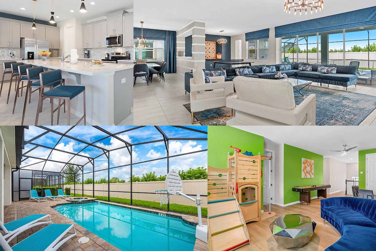 Beautiful and bright 6BR/6BA villa – larger model! with extra space inside and out! Enjoy the big private pool & spa, game room, and modern open layout. Pet friendly and ideal for families or groups of 14. Located right in front of the kids’ playground, soccer & basketball fields. Privacy screens designed for privacy and relaxation, with no direct views from neighbors. Guests get free access to two resort clubhouses with lazy river, water slides, restaurants, gym, and more!