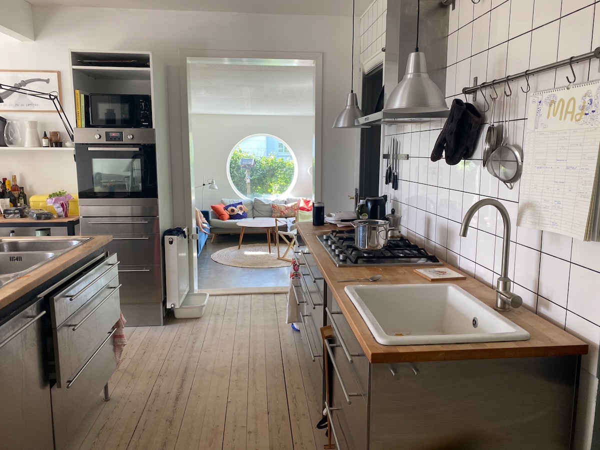 Authentic and renovated house (2015) in new Nordic modern style, placed in stunning nature with forrest in the backyard. Close to public transport and just 20 min away from Copenhagen. Ideal for couples, families or groups seeking a combination of Copenhagen-living and relaxation or active life in idyllic nature. If you fancy gardening, enjoy the 2200 squaremeters playground and feel free to pick fresh vegetables and fruits from the garden.