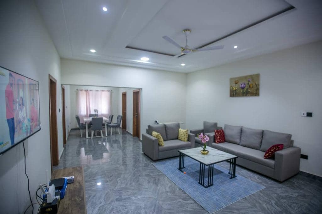 Gather your friends and family for an unforgettable stay in this spacious and stylish home! ✨ Nestled in a peaceful neighbourhood, this modern retreat is perfect for creating memories—whether you’re relaxing indoors or exploring the city. Conveniently located just 6 minutes from Achimota Mall and only 22 minutes from both Accra Mall and Kotoka International Airport, you’ll have easy access to shopping, dining, and adventures while still enjoying the comfort of a quiet escape