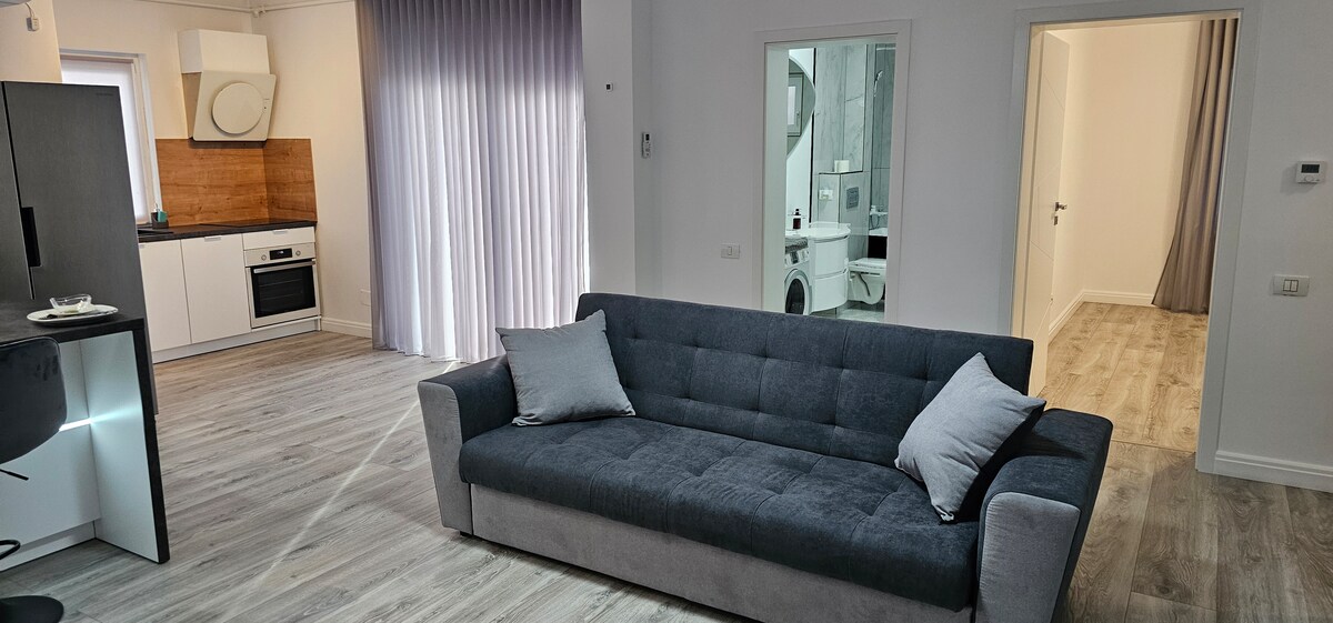 Relaxează-te în acest spațiu calm și elegant situat la 6 km de Aeroport și 8 km de centrul Timișoarei. Apartamentul dispune de aer condiționat, smart tv, wifi gratuit, bucătărie complet utilata. Parcarea este gratuită și supravegheată video. Oaspeții se pot relaxa în grădina imobilului.