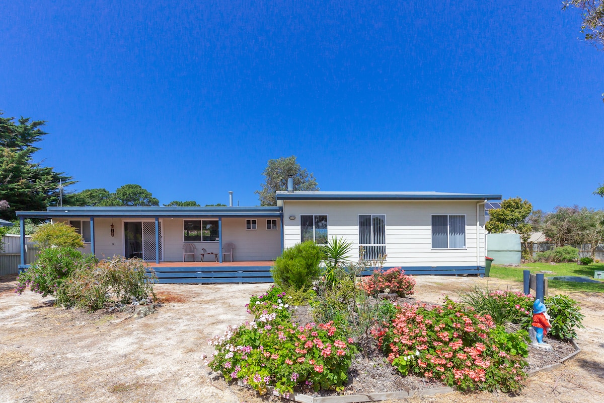 “PET FRIENDLY” 5 min walk to pristine 90-mile beach. The home offers a relaxing seaside holiday. Ideal all year-round holidaying. Bring fishing rods & golf clubs to play a round with the kangaroos. Elevated west facing takes in the sunsets while listening to the sound of the surf. Enjoy a BBQ & star gaze while you enjoy a quiet drink on the gated veranda to keep small kids and dogs safe. Walking distance to the Licensed shop for groceries/fish n chips next to the play ground. Check open hrs.