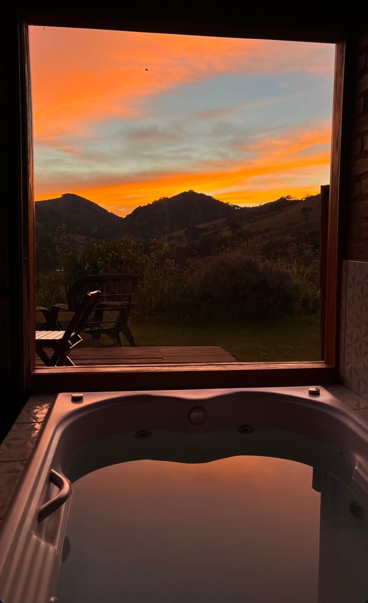 Relaxe neste lugar único e tranquilo. Vista maravilhosa . Lugar para casais apaixonados Chalé aconchegante, tranquilo. Banheira dupla aquecida com hidromassagem que fica no deck externo com vista para as montanhas Piscina com borda infinita com vista para as montanhas. O quarto cama queen e ar condicionado No banheiro chuveiro a gás e torneiras aquecida Disponibilizamos roupões de banho Nossa cozinha é toda equipada com Cafeteira , forno Elétrico , fogão elétrico de 5 bocas,