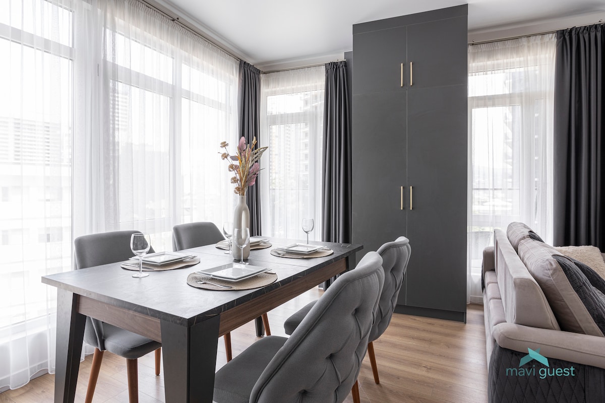 Sunny, bright, stylish, place filled up with different colors, with a great view to Black Sea, equipped with all facilities. Just few minutes to sea shore by feet. Shopping malls, dolphinarium, great choice of restaurants. Smart TV with cable.