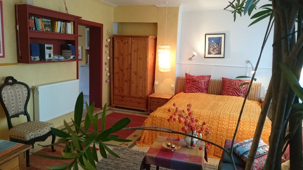 The room has its own separate entrance and is located in the basement. A small hallway (which is only used by the guest) leads to the room. The room is connected to the private bathroom with shower. Optionally (for a fee), the sauna can be used. WiFi is available. A fridge and a microwave as well as a kettle are available for use. Bicycles and motorcycles can be safely stored in the garage.