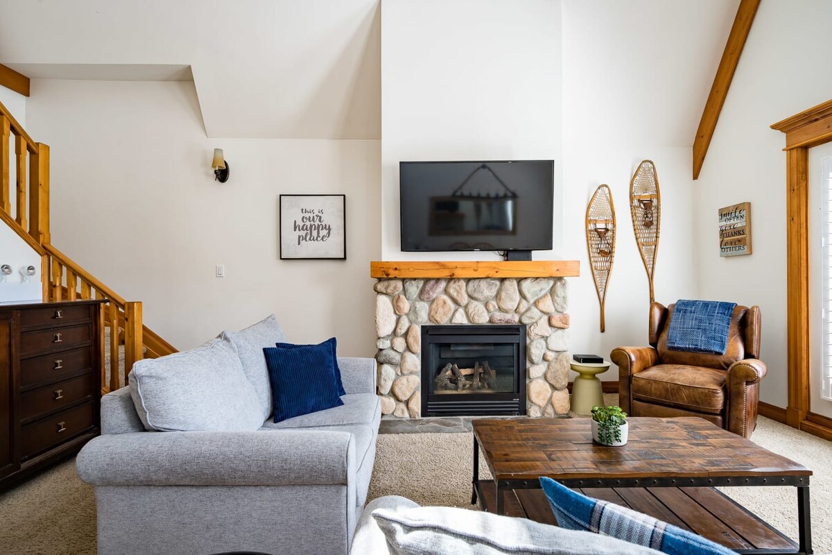 SHUTTLE, HOT TUB, SEASONAL POOL 5-7 minute walk to the Blue Mountain Village. This cozy 2 bedroom condo gives you immediate access to the action or a quiet place to relax by the fireplace while looking out at the mountain views. ★ ★ SMART TVs in living room (WIFI and Cable) and bedrooms (WIFI) ★ Family Ready! Games, booster seat, packnplay etc ★ Resort hot tub with indoor changeroom and washrooms Pool closed for the season