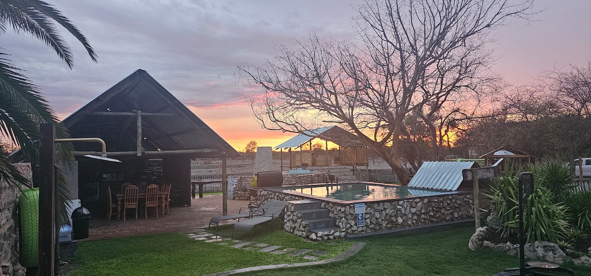 TAMBOTI FARM ACCOMMODATION offers a Warm Welcome to it's 4 Rustic Bungalows. 2 Adults + 2 Children under 14 can be accommodated in each Bungalow. Please note it is assumed that 2 Guests share a Bungalow. When requiring 2 Bungalows please make separate bookings. A Fully Equipped Self- Catering Outdoor Kitchen, Pool, Sundowner Deck, Hot Tub and Play Area. The Farm is En-Route to the Etosha National Park, as well as the Kunene, Okavango and Caprivi Regions in the North of Namibia.