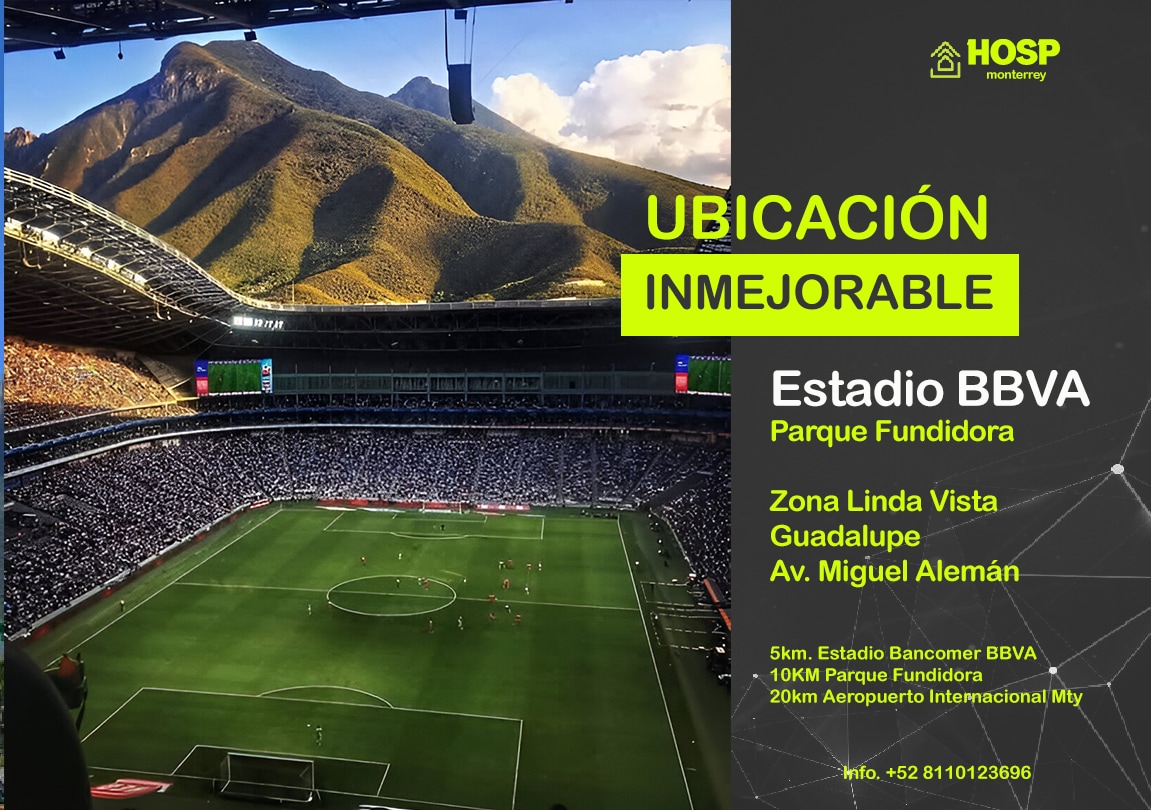 Este lugar tiene una ubicación estratégica: ¡será muy fácil planear tu visita! avenidas principales. a pasos estadio BBVA, EXPO walmart y sams, a tan solo 850mts otros centros comerciales, HEB, cine, bancos etc. a menos de 10min . a 15min de arena mty y cintermex. entrada independiente de cochera techada con portón eléctrico, llegas a la hora que tu quieras sin esperar acceso, lugar tranquilo y céntrico de fácil acceso. Internet, agradezco caliente, aire acondicionado, todo nuevo.