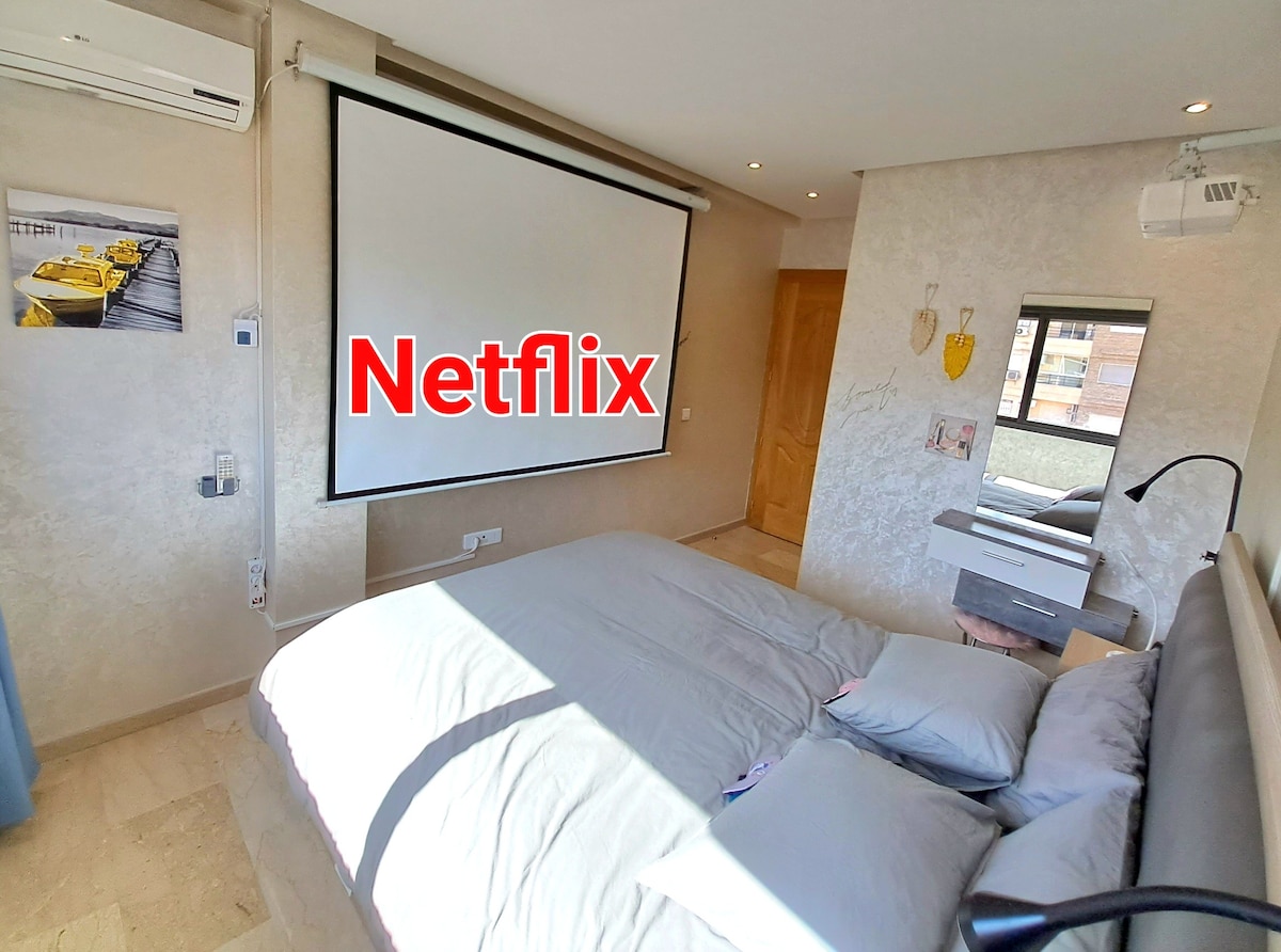 This superb, elegant and refined accommodation is close to all shops and amenities The apartment is located near Marrakech train station, in a secure building with camera, elevator and parking. It consists of a living room, two bedrooms with bathroom, an equipped kitchen and a superb entrance hall