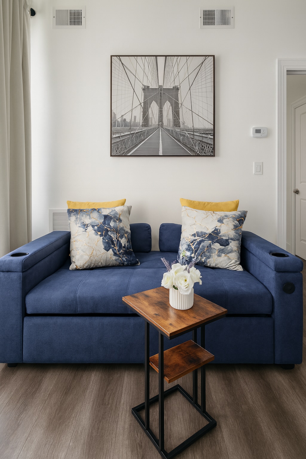 Wake up to breathtaking NYC skyline views in this modern 1BR apartment, just 20 minutes from Manhattan. Perfect for couples, families, or business travelers, with a quartz kitchen, sun-filled living room, in-unit washer/dryer, WiFi, and central A/C. Enjoy comfort, convenience, and quick access to NYC while staying in a peaceful West New York neighborhood.