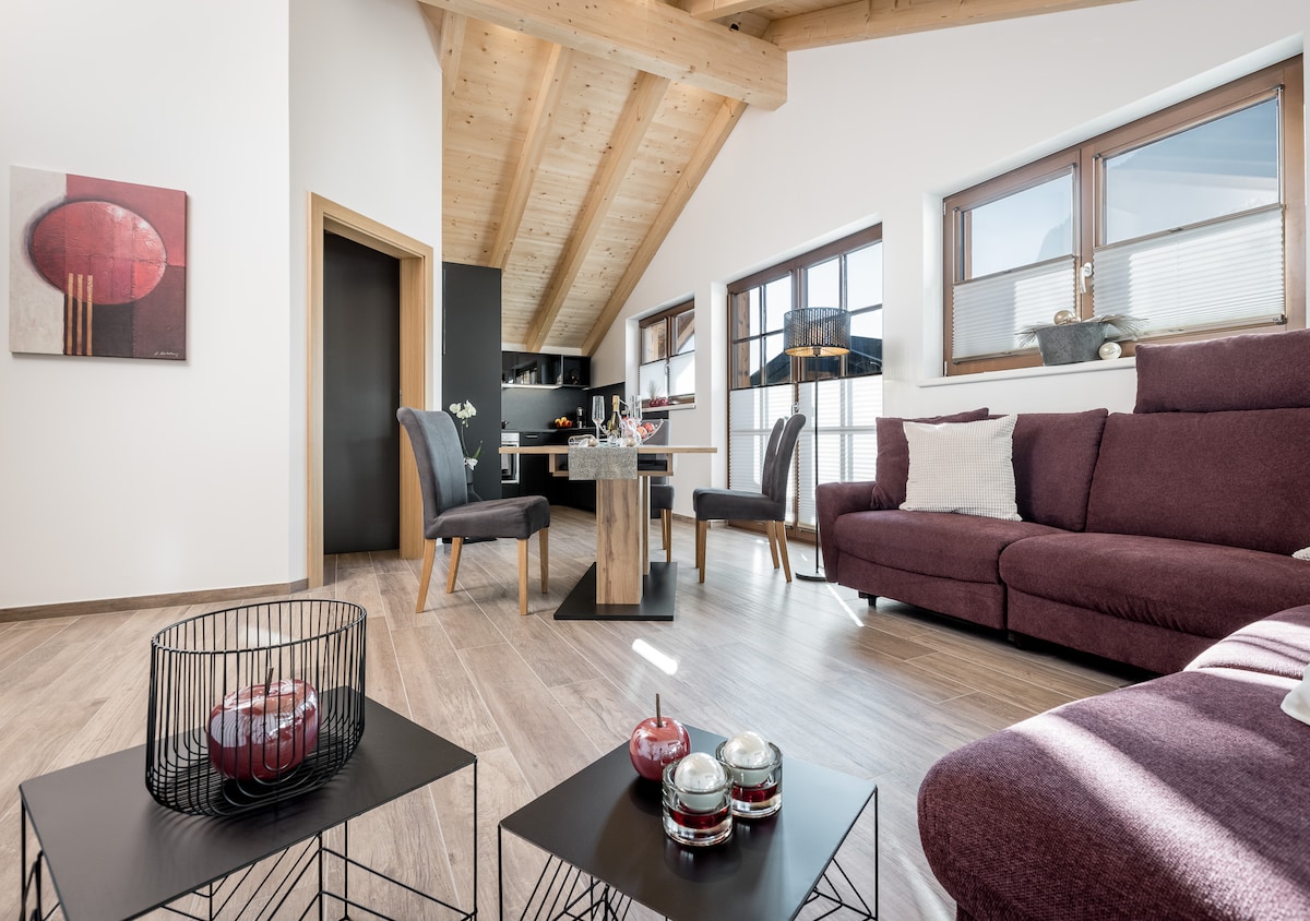 Elegant penthouse apartment in modern alpine style on the Seefelder plateau. The cozy, quiet apartment on the last floor is designed for up to 4 people very comfortably. It has a bright living-dining area with modern fully equipped kitchen, two double bedrooms, two bathrooms, underfloor heating, free Wi-Fi and a very large private terrace. From there you can enjoy the breathtaking view of the mountains and the Inn Valley, both in summer and in winter.