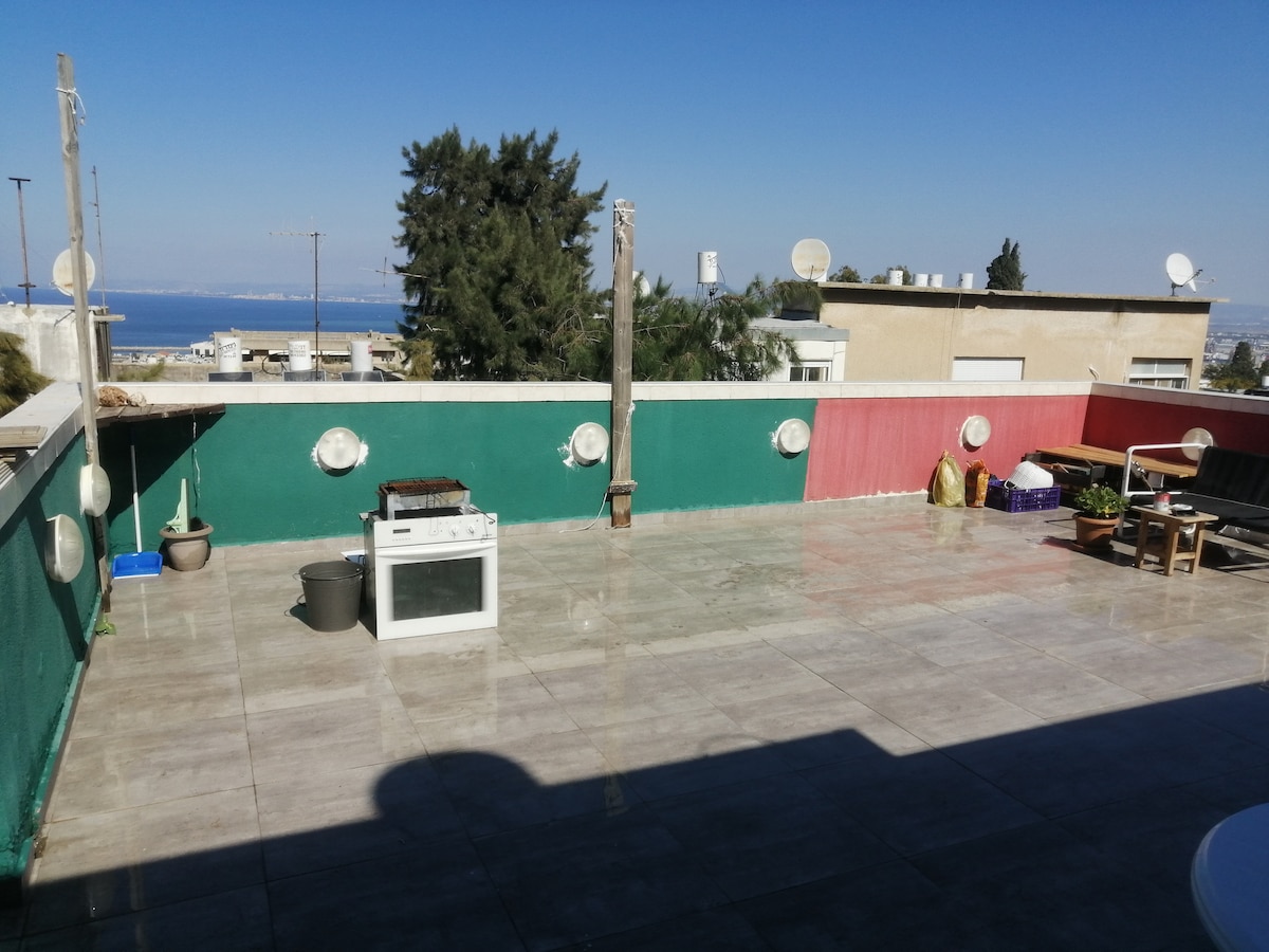 Newly renovated Penthouse, this 150-square-meter home with a 50-square-meter balcony offers stunning sea and Haifa views. Featuring an outdoor kitchen, the penthouse near Sami Ofer provides free parking and a fully equipped kitchen. Its spacious salon is perfect for family gatherings. Walking distance to markets, restaurants, and a 2-minute walk to the bus stop; the highway is 4 minutes away. Please note, this is our personal home, but we love hosting guests while we're away.