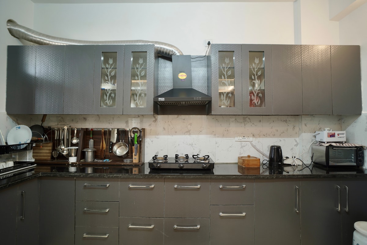*** SPECIAL: FREE DAILY HOME-COOKED BREAKFAST & FREE WIFI This is a private bedroom with dedicated kitchen and bathroom right outside the bedroom, just 6min drive from AIIMS. You also have access to a bright balcony and rooftop full of plants and home-grown veggies by our family in a quiet, peaceful Rishikesh neighborhood of authentic local vibe. Feel at home in the warmth of a family away from home when staying with us! * Laundry available for extra fee * Cooler provided in summer, no AC