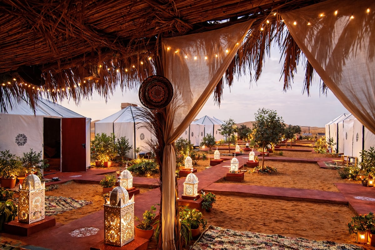 GOLDEN DUNES VIEW LUXURY CAMP Experience a serene getaway overnight in the heart of Sahara Merzouga, Our camp located in Erg chebbi dunes & is perfect for couple's and solo travelers' families with children and infants, and we even welcome your furry friends to enjoy the best experience and get wonderful memories about Merzouga Area and also crave luxurious comfort desert camp.