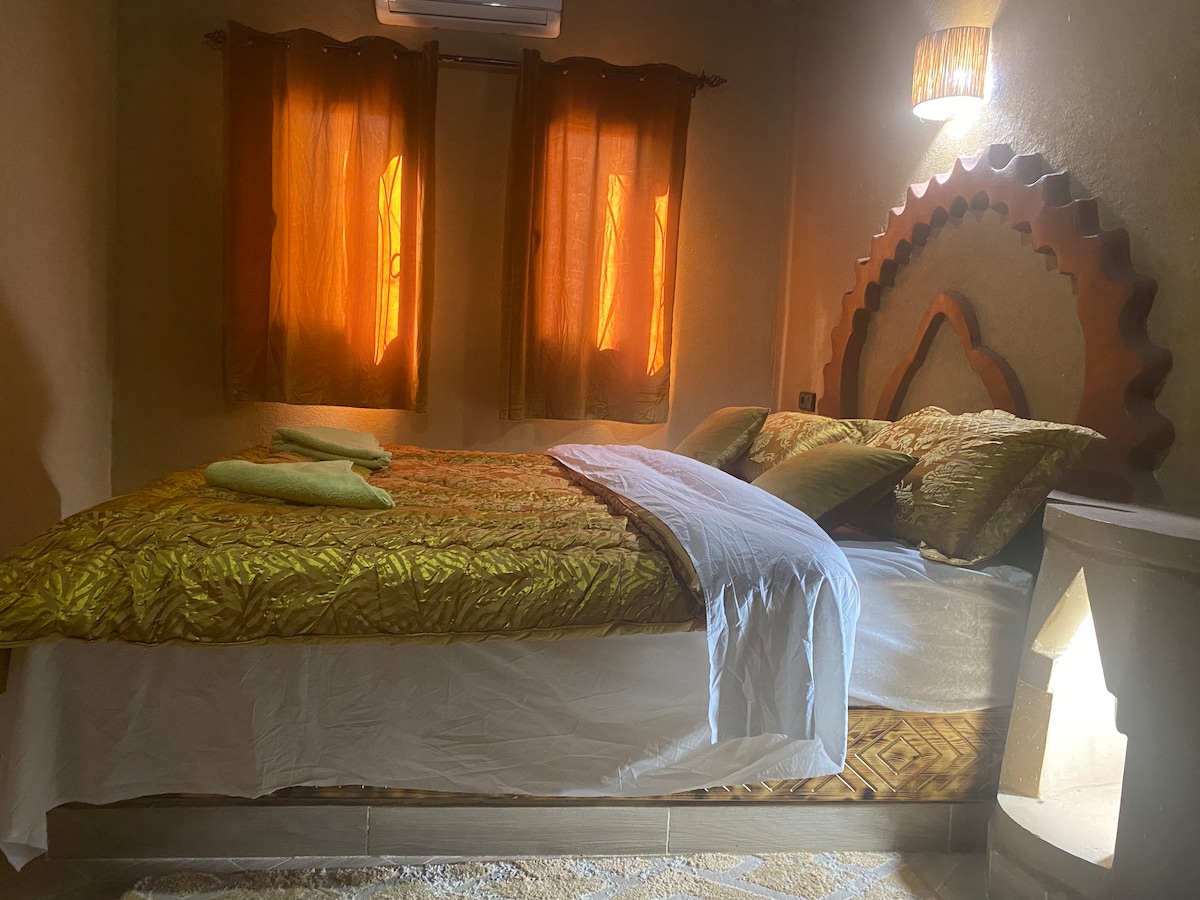 Immerse yourself in the peace of a spacious home. Far from mass tourism, this space of serenity offers you, from its terrace, the unforgettable spectacle of the sunrise over the majestic dunes! Enjoy a unique experience: independently or with Hamid, your expert host in bio-tourism. Organization of tailor-made immersive trips and complete immersion in Berber culture and its landscapes (oasis, nomadic villages). Ideal for travelers looking for peace and local traditions.