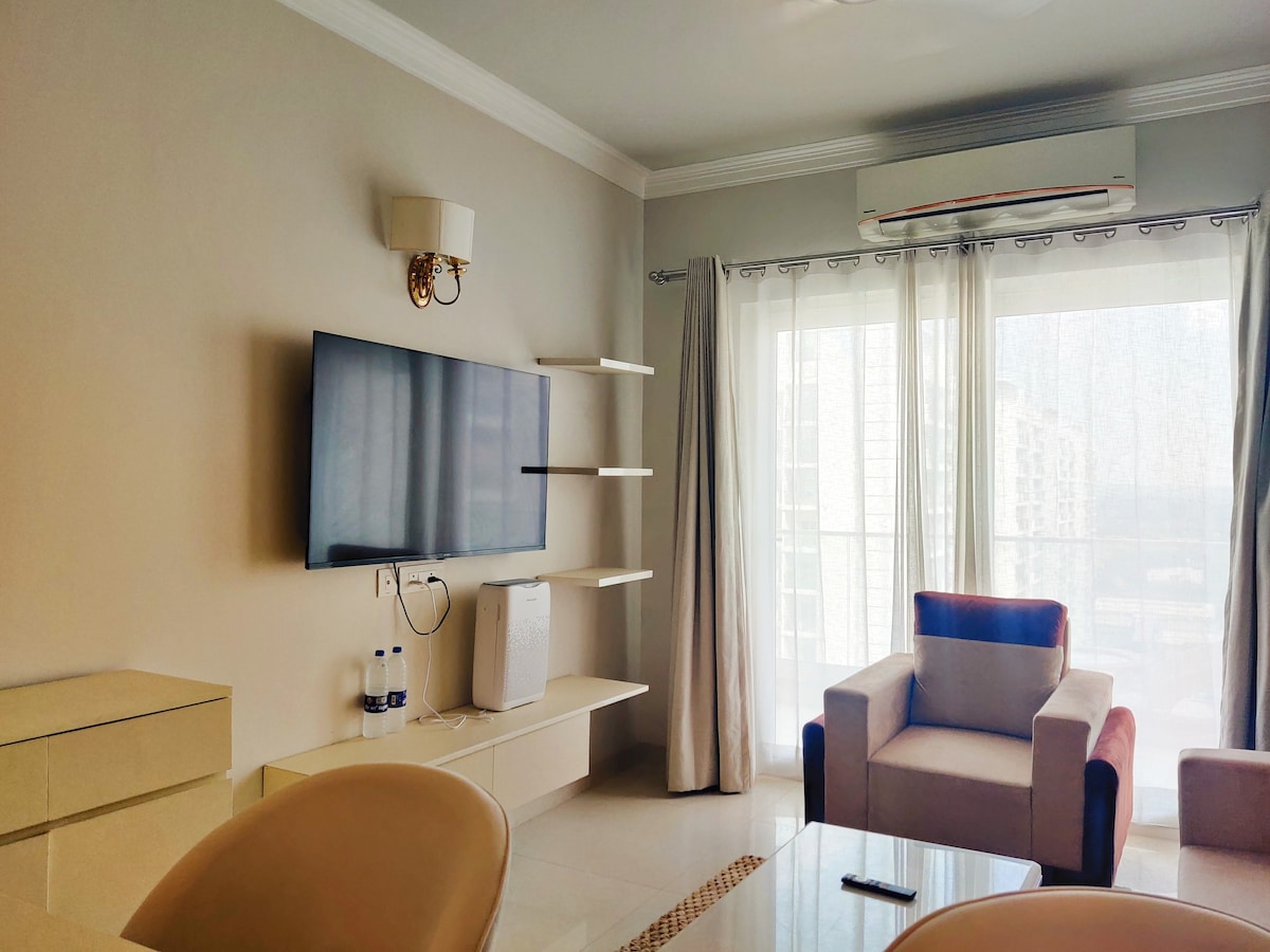 Relax at this peaceful & chic place to stay. Free hi speed WiFi. Free access to Gym swimming pool & kids water park Outdoor Kids play area . Access to tennis courts, Basketball courts & Badminton courts. 24*7 security with cameras installed in common areas. Restaurants within the premises with live music and BYOB facility. Ur cafe & cafe flora within the society.