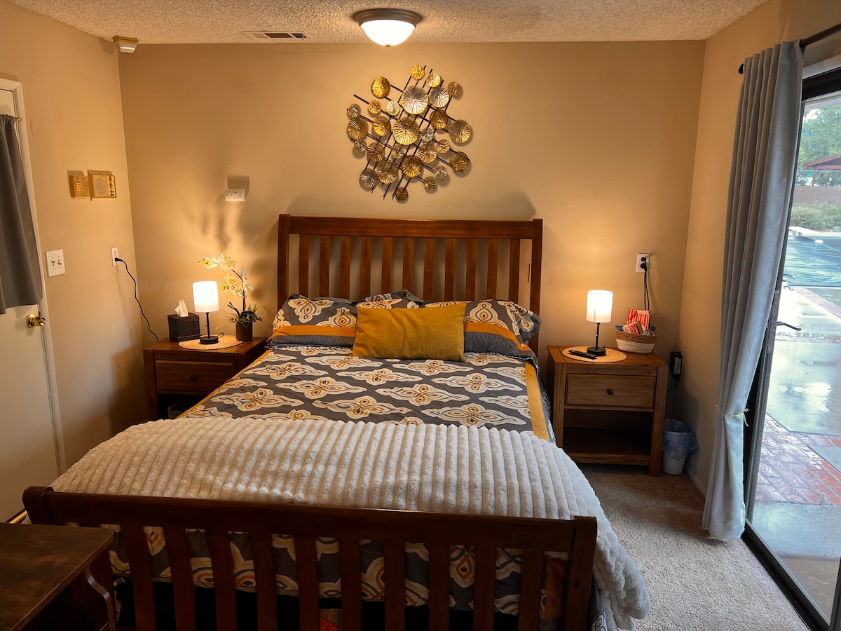 Nice clean cozy space all to yourself. Luxury Queen Bed. TV with roku only and dvd player with some dvds Spectrum high speed internet. No gas appliances - Cooking is with microwave only. Own parking space in front of unit Unit is attached to main house (has own entrance & shares no access) IMPORTANT! Please be sure to read the HOUSE RULES. 1 1/2 mi to grocery (Stater Bros.) and other shops, restaurants, & fast foods and laundrymat.