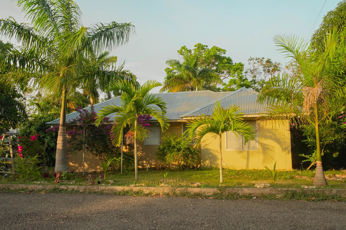 Forget all your worries in this spacious green and serene space. Five (5) minutes from the beach for total relaxation. Grab your juicy Jamaican patties in Town and then don't forget your jerk chicken and jerk pork right in the back yard. Swing in comfort and enjoy cool breeze on your phones or reading a book under the overflow of Jamaican fruit trees. Cut your favourite rose in the lush garden. 15 minutes from the Ian Flemmings Int'l Airport and 35 mins from the famous Dunns River Falls.