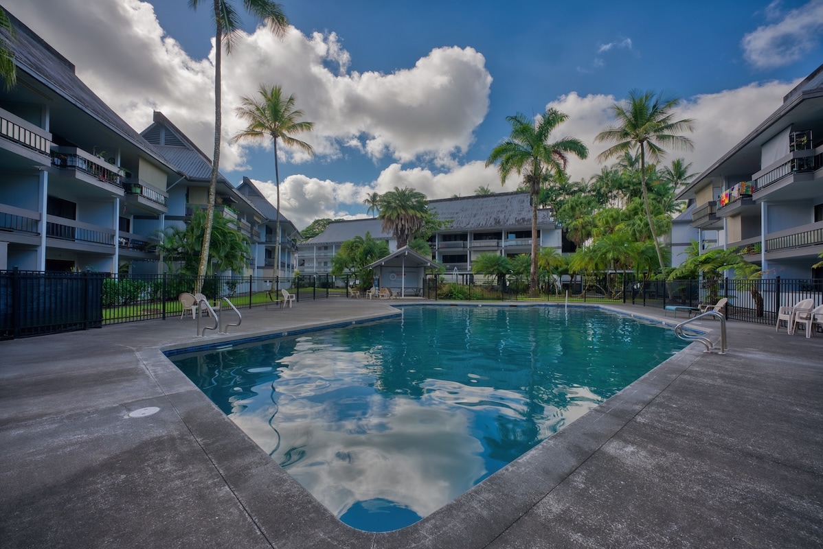 This beautiful air-conditioned condo is perhaps one of the best located accommodations in Hilo. Near the center of town, yet the grounds feel like a Polynesian inspired zen oasis! Koi filled streams and ponds lined with walking trails meander through the complex with swimming pool. Minutes from the airport, farmers markets, golfing, downtown shops, and 100+ restaurants! The complex also backs to Wailoa State Park where you can walk through over 130 acres of beautiful grounds leading to Hilo Bay!