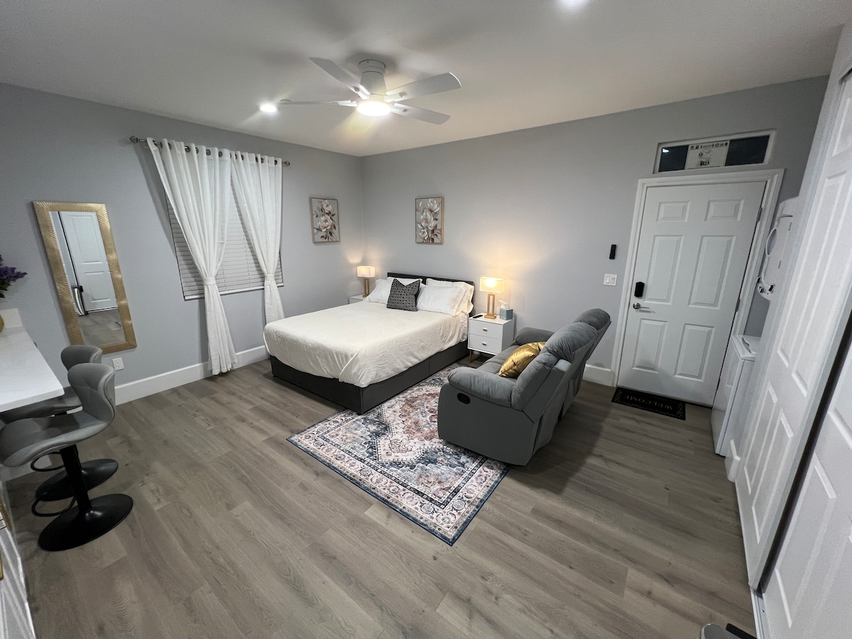 Indulge in elevated comfort within this thoughtfully curated in-law suite featuring a premium king bed, sleek futon, and 65” smart TV. The lift-top coffee table offers versatile function for dining or remote work. Enjoy a spa-style shower, dedicated desk, and Samsung all-in-one washer/dryer. Climate-controlled with private code entry and free parking. Stocked with refined essentials—where modern luxury meets effortless living.