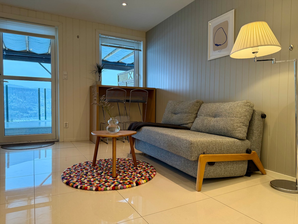 Enjoy a stylish experience in a nice 2-room apartment on the dock in Holmestrand. Here you live idyllically in maritime surroundings with stunning lake views from both the balcony and your own roof terrace. The apartment is centrally located, with a short walking distance to the railway station. All of the everyday necessities are right outside the front door and the area offers great hiking opportunities. The apartment has a cozy and warm atmosphere. It has a well-equipped kitchen, as well as elevator access, washing machine and dryer.
