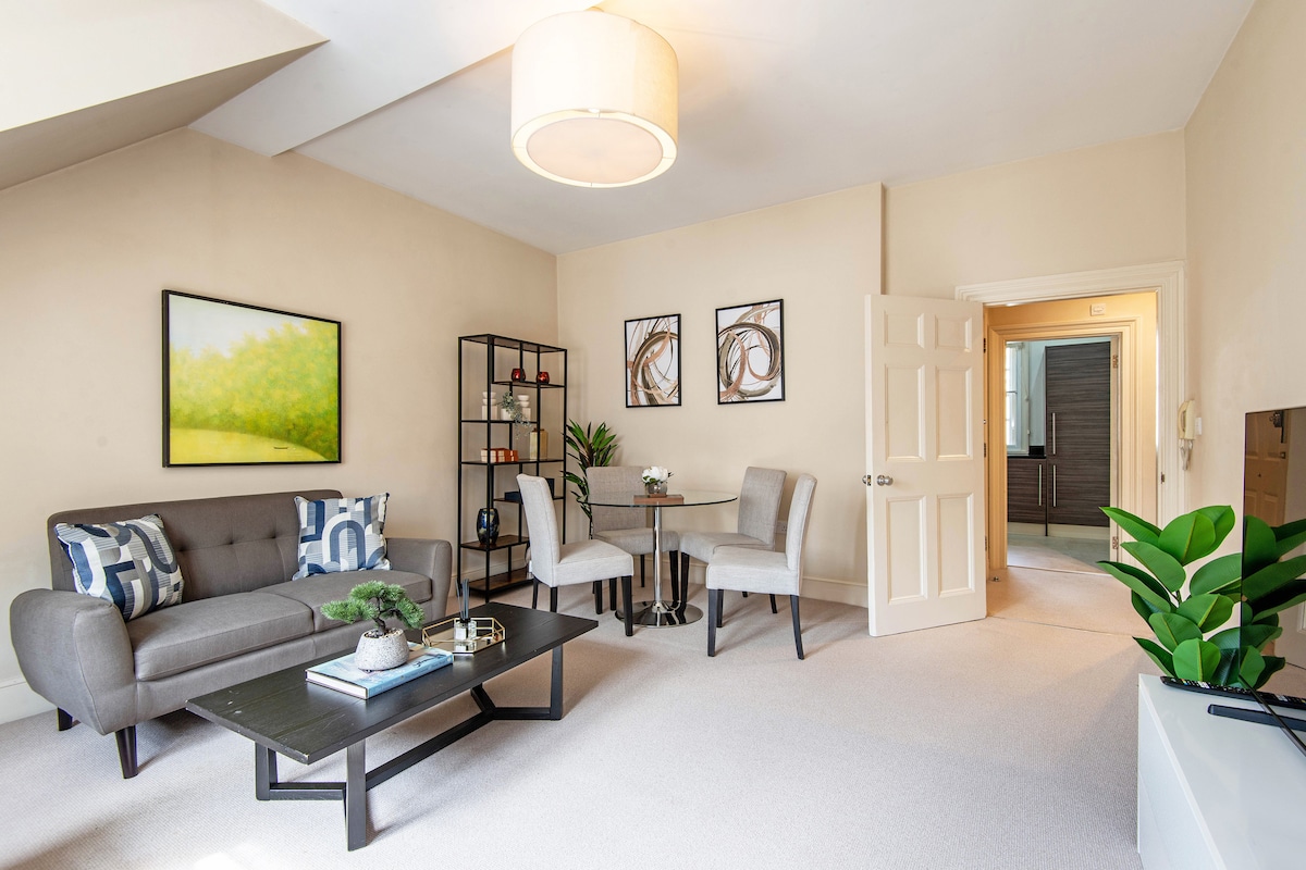 Stunning studio located on the First Floor of this impressive Victorian House on a tree lined street adjacent to Kensington Palace. The studio has been recently refurbished with a brand new bathroom and redecorated. There is a double bed in the studio room and a sofa bed. The studio benefits from a terrace to the front overlooking the tree lined street. Please do let us know if you would like the second bed set up.