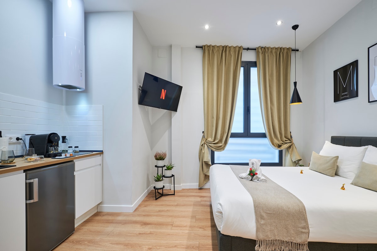 Bright and cozy Nordic-style studio in the heart of Madrid (Historic Center), 5 min from La Latina and 8 min from Plaza Mayor. Queen bed with 300-thread-count Egyptian cotton linens, high-speed Wi-Fi, Smart TV, fully-equipped kitchen, Nespresso, A/C, smart lock, and 24-hour check-in. Walk to El Rastro, Madrid Río and Museo Reina Sofía. Ideal for romantic getaways, sightseeing or teleworking. Book now and experience Madrid with all the amenities in a beautiful property.