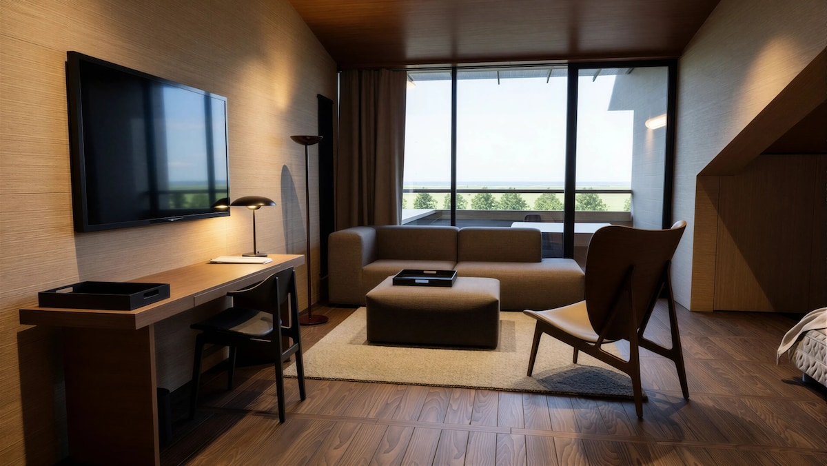 Spacious suite in a brand-new hotel with a relaxing nature view. Accommodates up to 3 guests with a king-size bed and a single sofa bed. Features a private bathroom with toiletries, minibar, and gym kit. Breakfast buffet is included daily. An extra bed is available for a 3rd person.