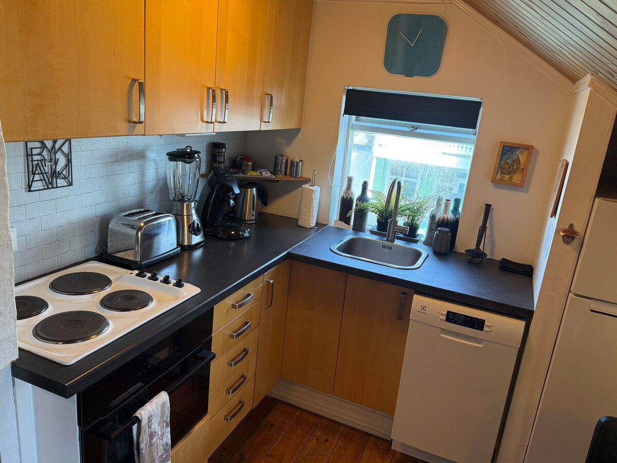 Bright and atmospheric flat in the heart of downtown Reykjavik. Stay in walking distance to Reykjavik the museums, shops, cafés and buzzing life yet in a quiet street in a charismatic Reykjavik townhouse with a garden. Small cosy rooftop flat (top floor in house with 3 flats) with a warm and minimalistic interior, a little balcony towards the garden and a kitchen with utensils to cook and a separate bedroom. The bathroom w bath tub is under the roof (shower under 170 cm) and sitting toilet.